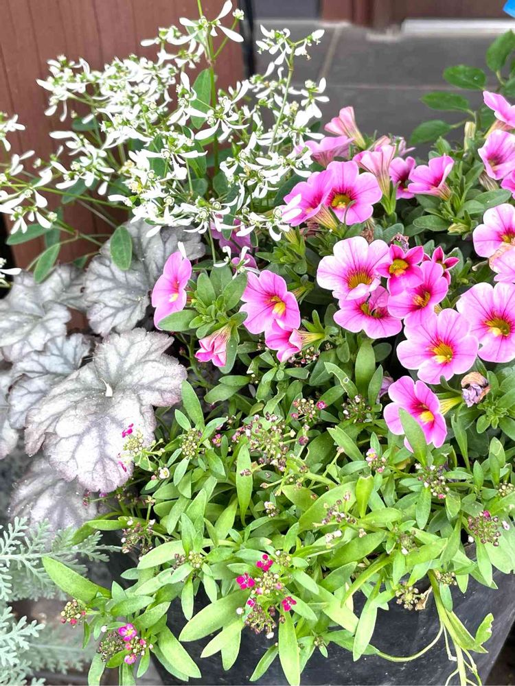 かわいいペチュニアサンバとダイヤモンドフロスト、ヒューケラの渋い色で涼しげな寄せ植えですね