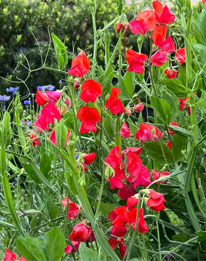 ブルーフラワーガーデンの手前、ピンクフラワーガーデンの赤いスイートピーがたくさん咲いています。優しいピンクのスイートピーを期待していたけどこんな情熱的なコも素敵(ღ˘⌣˘)❤︎