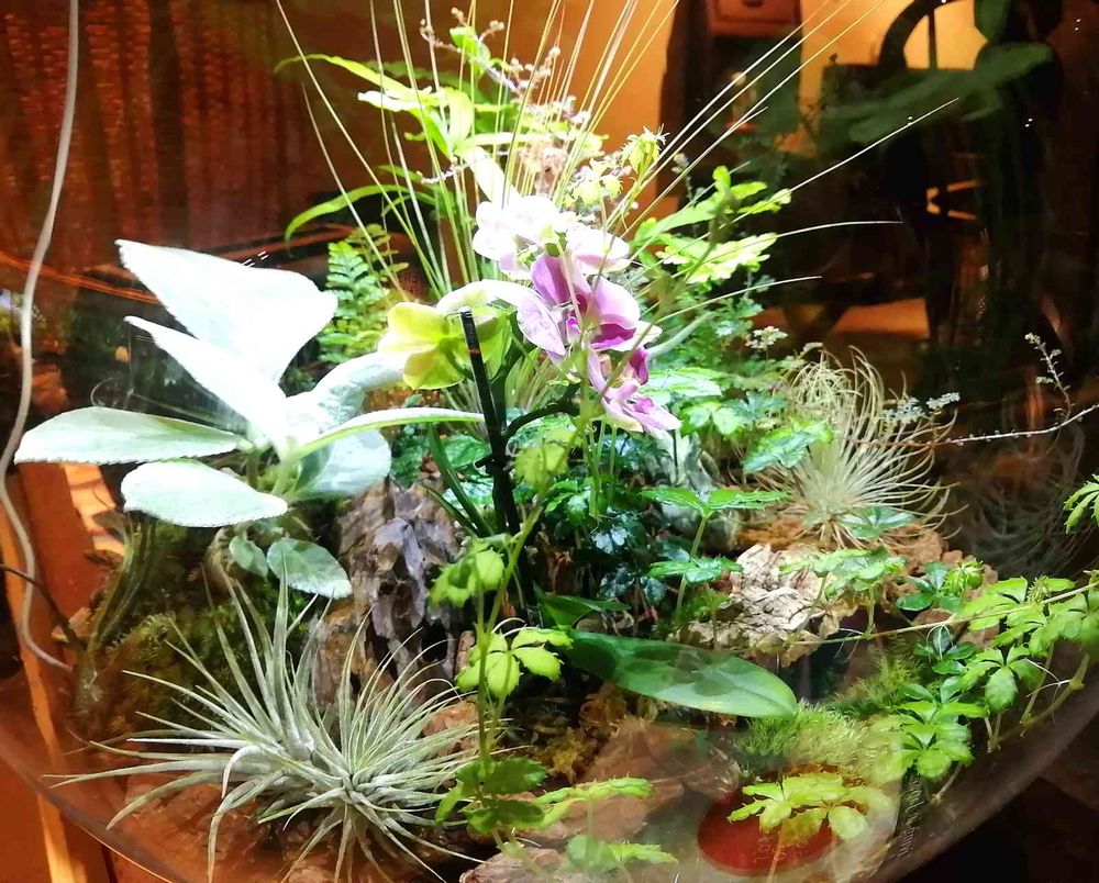 テラリウムの語源は、ラテン語の「テラ(terra)= 大地・陸地」と「リウム(arium)= 場所・空間」を合わせた造語で、ガラス等の光が通る密閉された透明なケースの中で、陸上の生物(動植物等)を育てること。