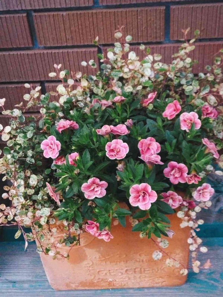 🍀ダイアンサス・ピンクキッス🍀と🍀斑入りワイヤープランツ🍀の寄植えです😊