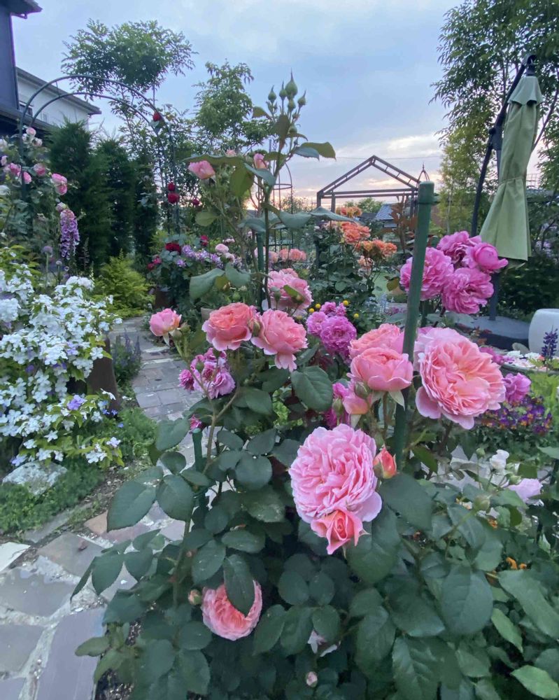 夕焼け映えしてるバラはかおりかざりさん😊今、お庭の主役❤️