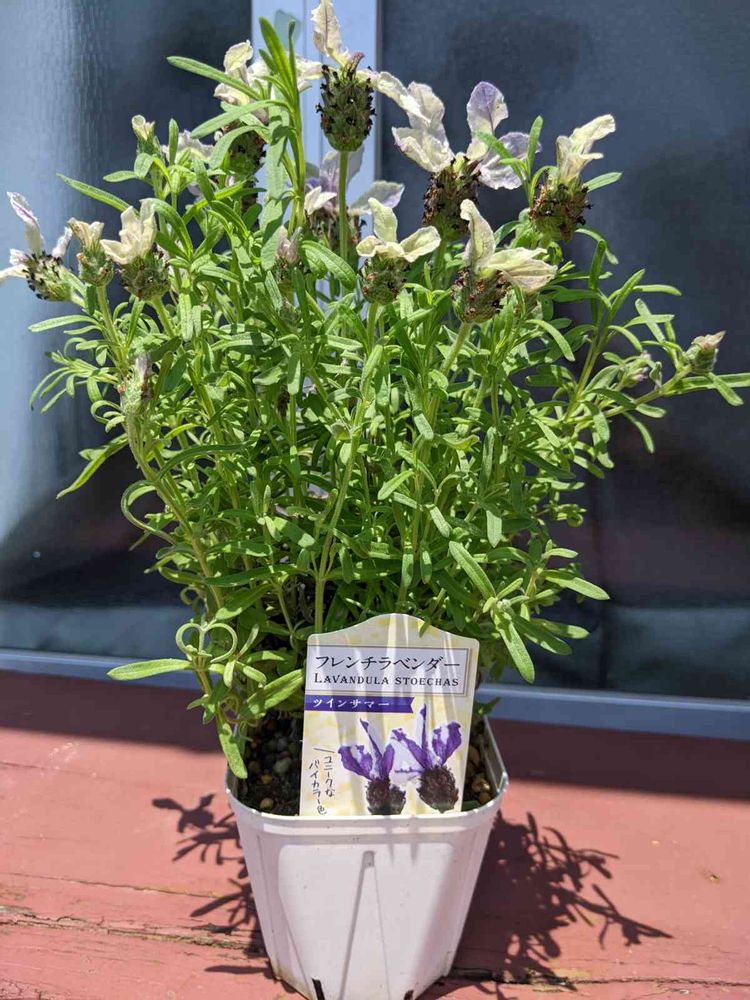 新入りさん。フレンチラベンダー。こんなオシャレな花🌼🏡に、似合うかなぁ~低下より半額にて、買い占めました。🤣🤭👍🙋
