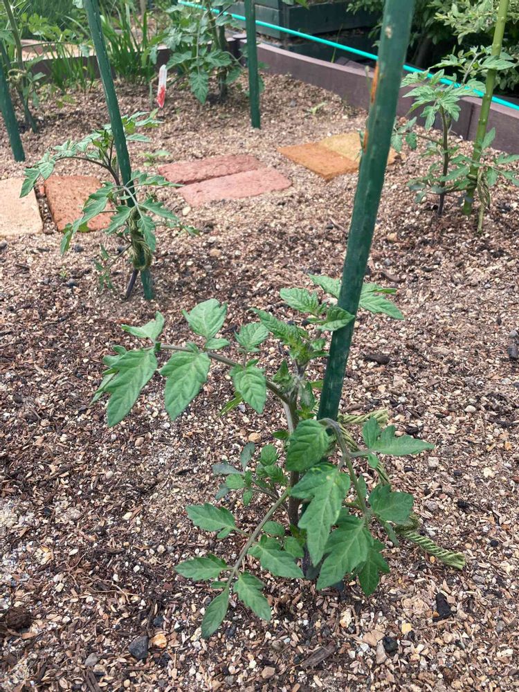 ポットで葉が黒ずんで成長が止まり、もうだめかとちっちゃいまま畑に植え付けたらぐんぐん成長して1番花が見えてきた。