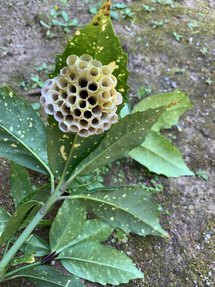 アオキの木が混みあっていて、風通しが悪そうだったので透かし剪定をしました。内側から枝元ばかり見てバサバサ切って、切り終わった枝を片付けていたら、蜂の巣が枝に😱