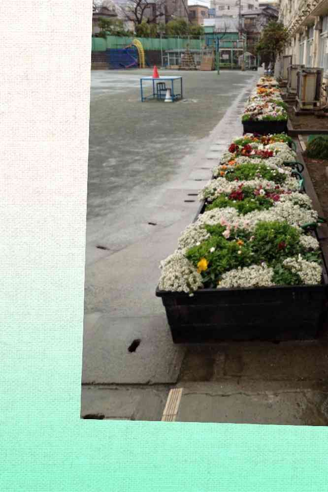 屋上に巨大なガーデニング、奥に畑、手前に水田、夏は立派なグリーンカーテン、そして、冬でもこの花壇。都内なのに、ガーデニングにめちゃめちゃ力いれてる小学校です