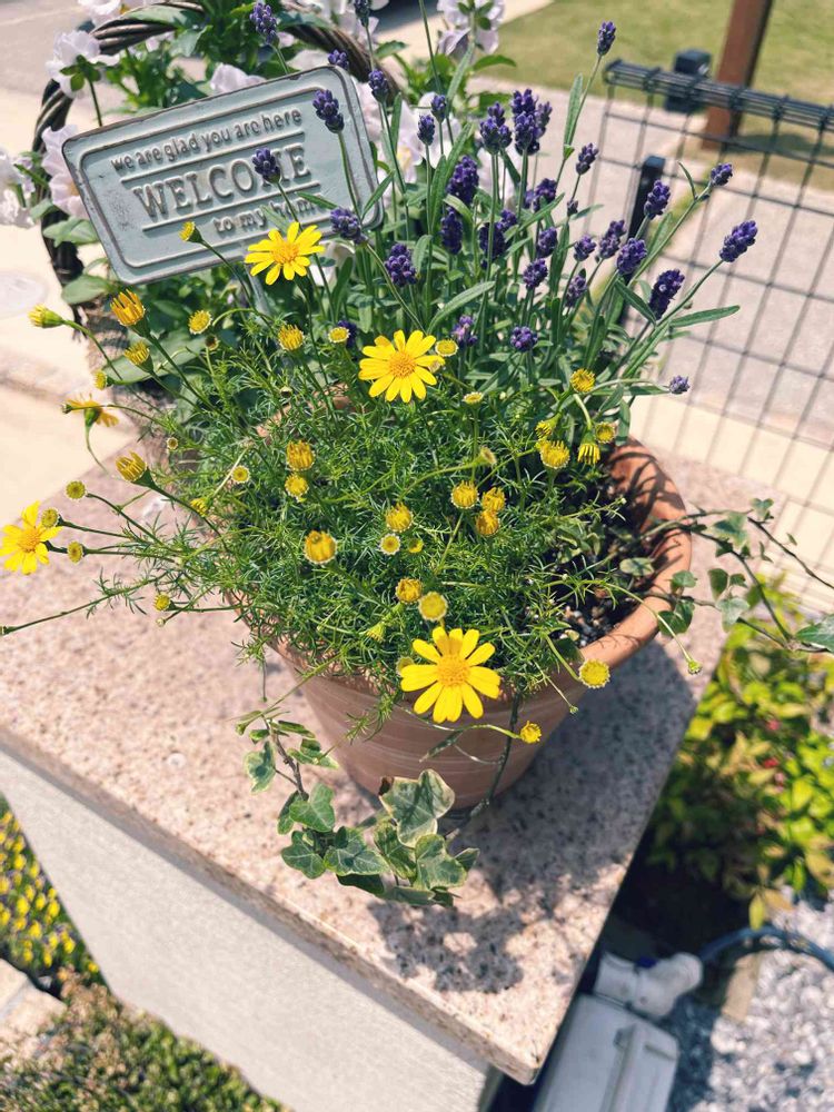 ラベンダーほのか さんと、ダークベルクデイジー🌼あとは、室内で瀕死状態だったアイビーを、外の方が調子良いんじゃないかと思い切って寄せてみました😅