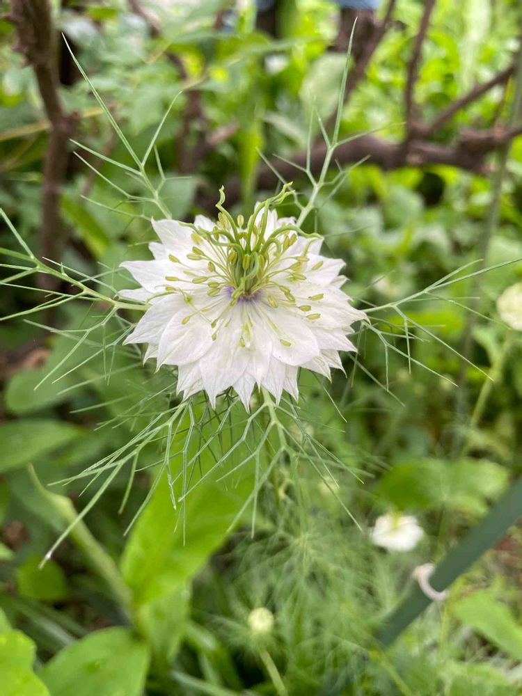 白のニゲラが咲きました。青はどこえやら、行方不明。