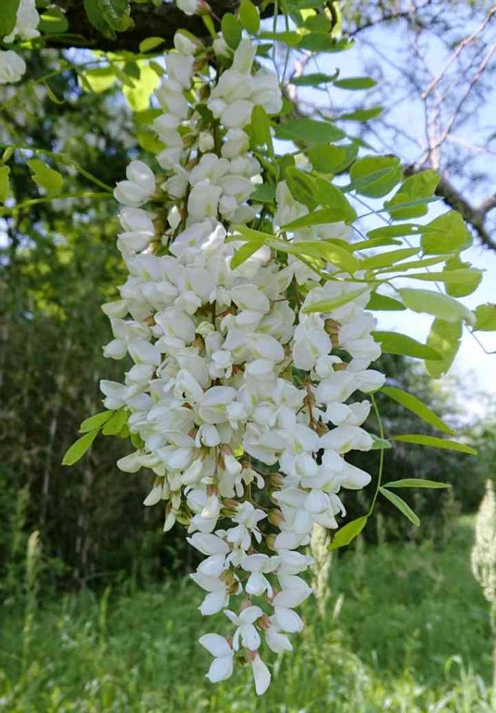 マメ科ハリエンジュ属の落葉高木。北アメリカ原産で明治時代初期に砂防林や緑化、蜜源の目的で導入されたが、繁殖力が強く、川岸や原野に野生化し自然林にも侵入して生態系を撹乱している。枝に刺があり、羽状複葉の小葉は先が丸い。花期は5~6月。花はフジに似た白い蝶形花で香りよく、長さ約15㎝の房に垂れ、天ぷらにして食べる。果実は豆果。長さ50〜100㎜の莢で、秋に熟すと褐色になり、破れて種子を出す。種子は長めの腎形。
