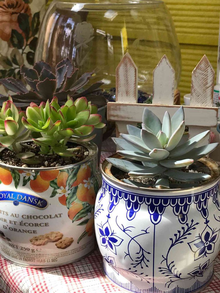 クッキー缶に植えました。霜の朝と天狗の舞錦。しばらくはおやつはクッキーだな。