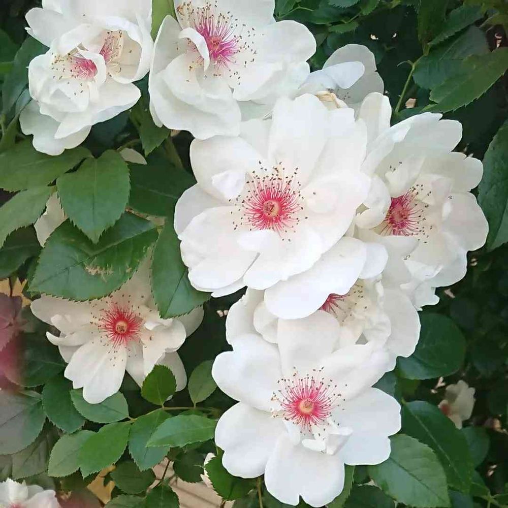 お店の前に植えてあったバラ。真っ白な花弁に真っ赤なしべが印象的でした。