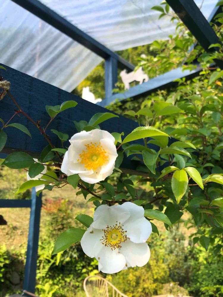 ナニワイバラ、一重のお花がナチュラルな感じでいいですよね🎶黄色いシベとのコントラストも可憐で💕