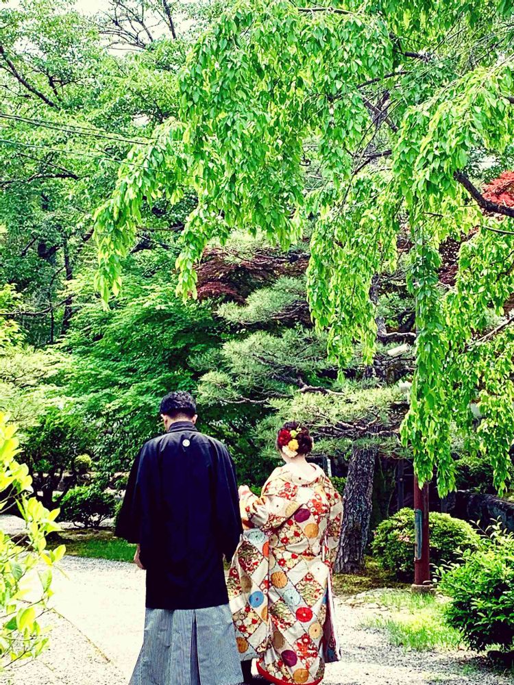 新緑の庭園と和装姿の幸せいっぱいの二人