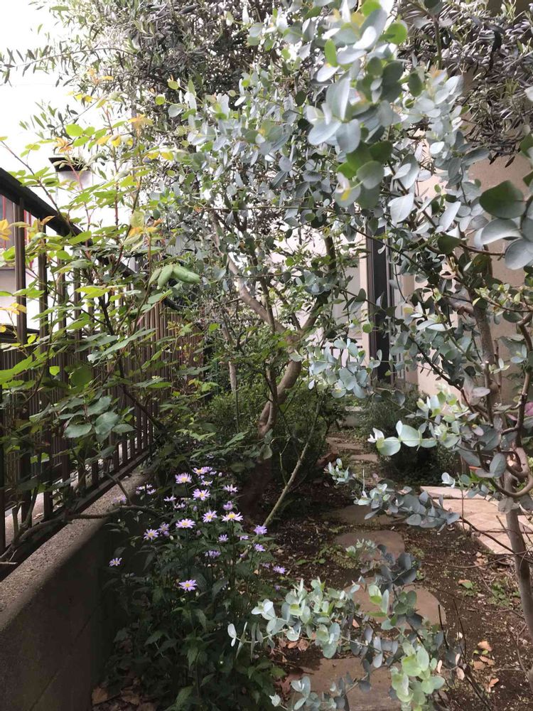 庭の入り口。マルバユーカリが伸びすぎて入り口がなくなった。。まぁ不思議な世界へようこそということです。