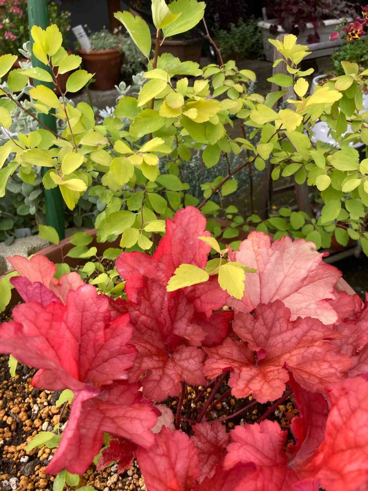 前からあったヒューケラ ピーチフィズと昨日購入してきたコデマリを一緒に植えて見ました✌️中々に良い色合い☺️