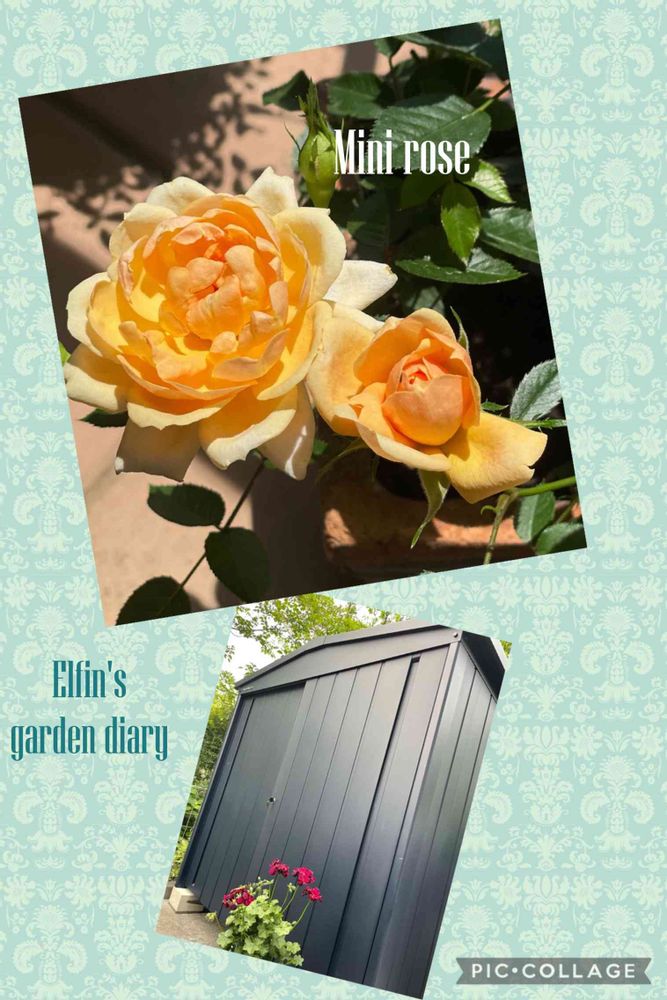 今日のpicは、やっと咲き始めたオレンジのミニ薔薇と設置工事完了した三角屋根の物置とアイビーゼラニウム トミーのコラボ写真。