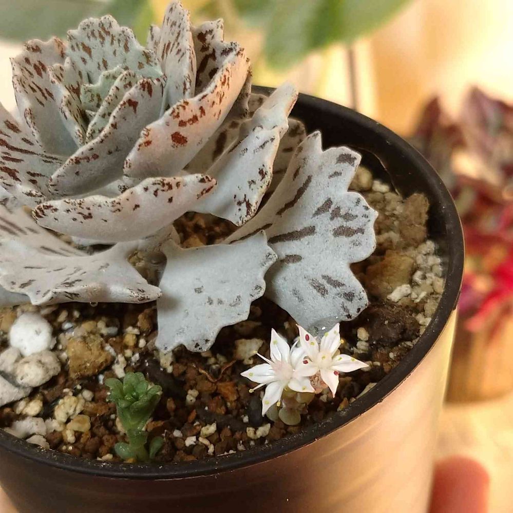 先日某フリマサイトで鉢を購入した際、ミニミニサイズの多肉をおまけに頂いたのでロンボピローサの鉢に居候させましたが、