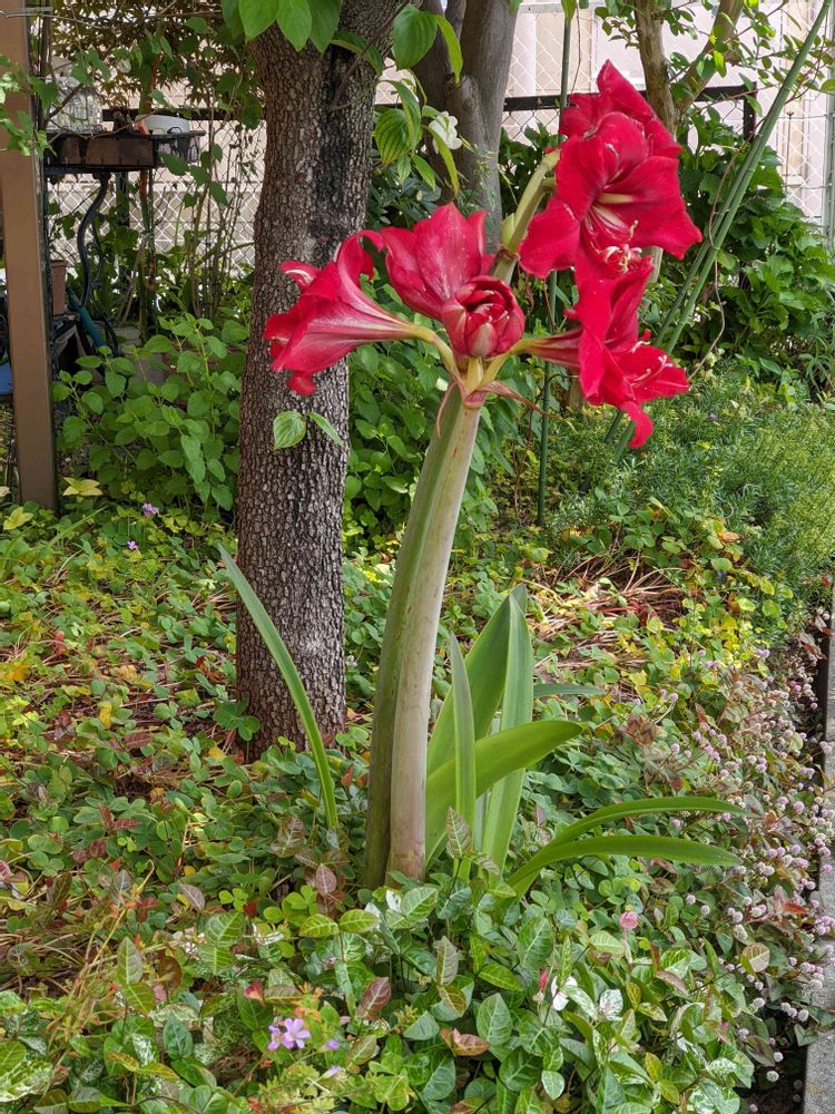 庭のハナミズキの下で二本立ちで満開の🏵️アマリリス🏵️