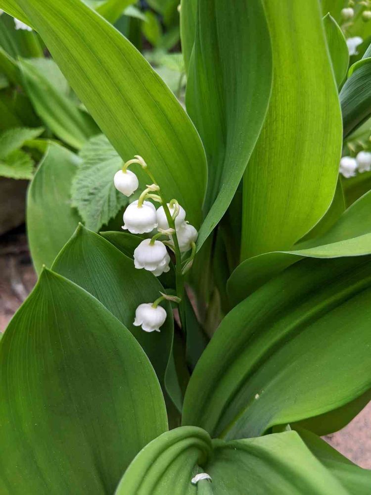 本州にあるドイツすずらんと違って、葉っぱに隠れるように咲くので、まとめていっぺんに撮影はできません。これも、葉っぱを寄せて撮影したんです。奥ゆかしい⁉️