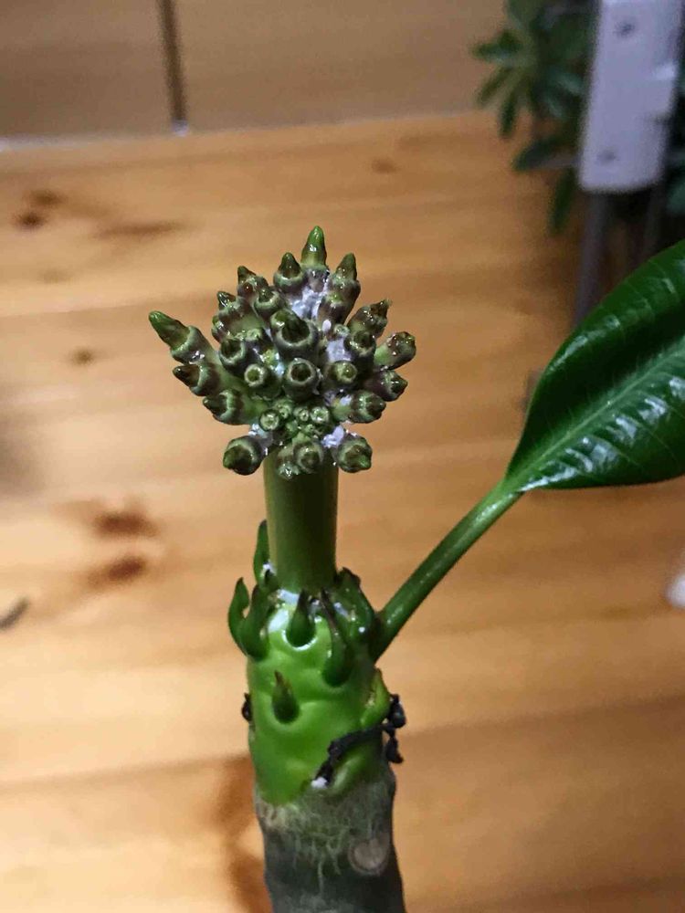 3/14に投稿したプルメリアの花芽が着実に大きくなって、葉っぱも出てきたー👍