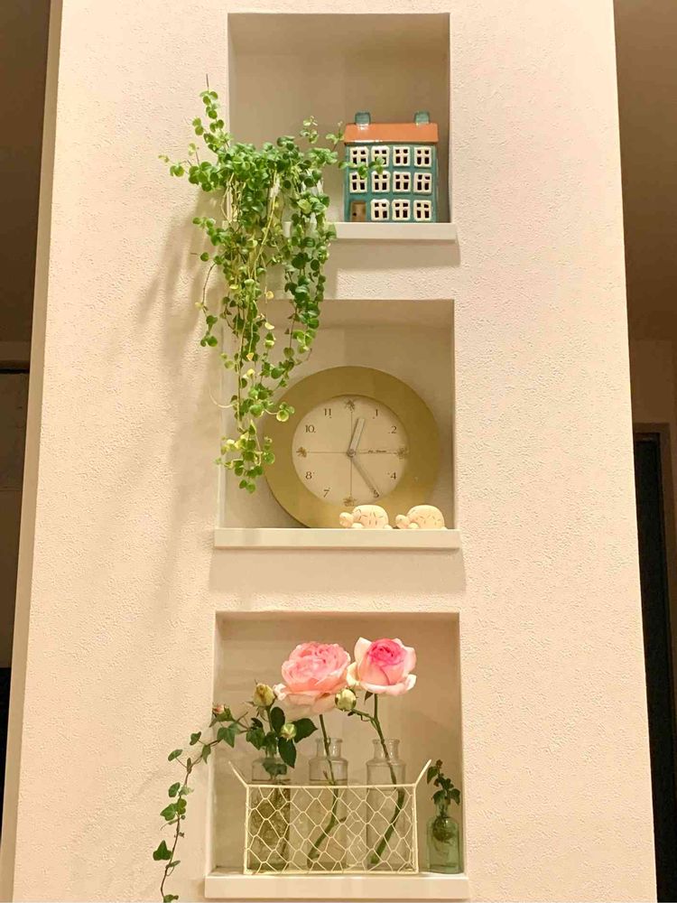 これはリビングの壁なのですが、時計やお花を置けるので重宝しています😁💓