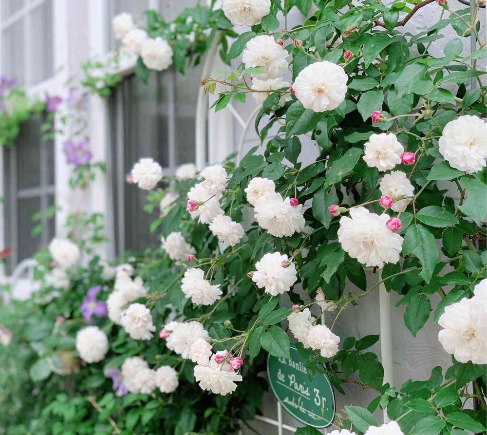 白いつるバラとパープルのクレマチスのコラボ♡💜