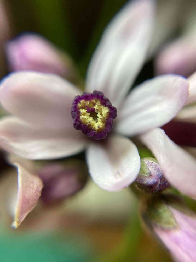 高木でしたが、幸い落ちていた花があったのでアップにできました。薄い紫色の花弁、蕊は濃紫で真中黄色🤍💜💛色も香りも大人風です😍