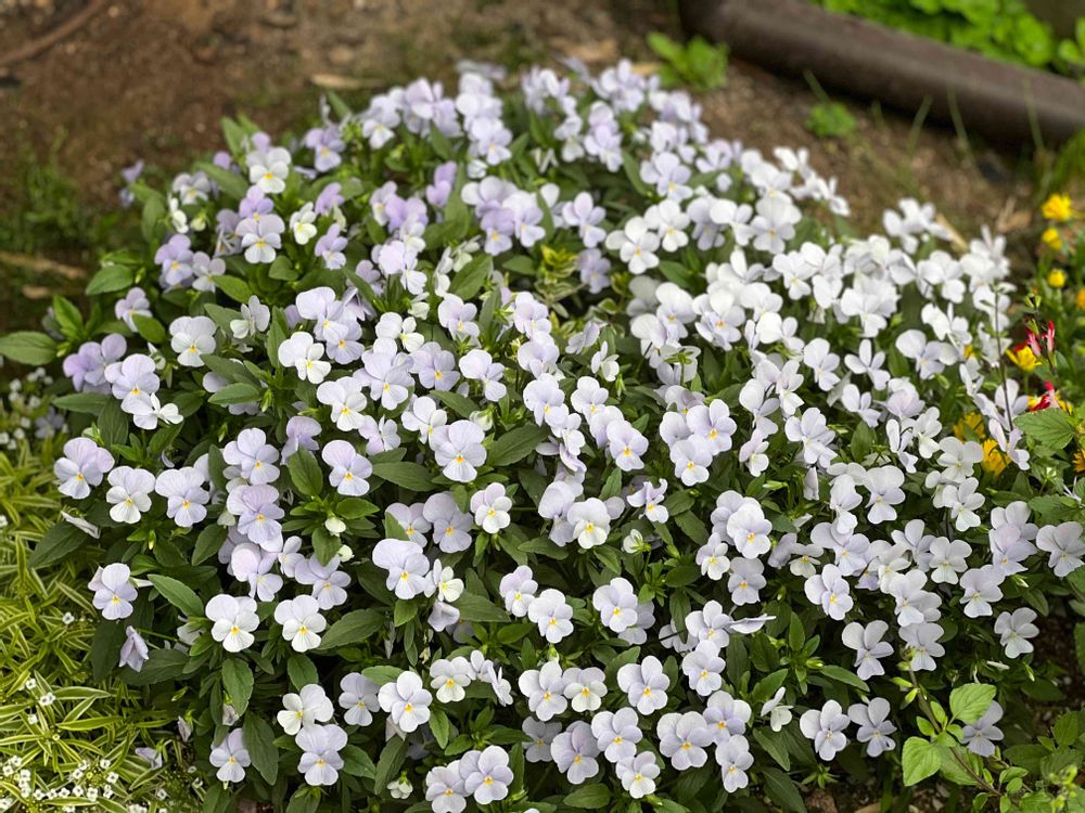 種から育て家周りに植え付けたビオラ ビビ ヘブンリーブルー(爆咲)中心部のアベリア存在無しです(汗)こちら鳥取では、まだまだパンビオが楽しめています(嬉)