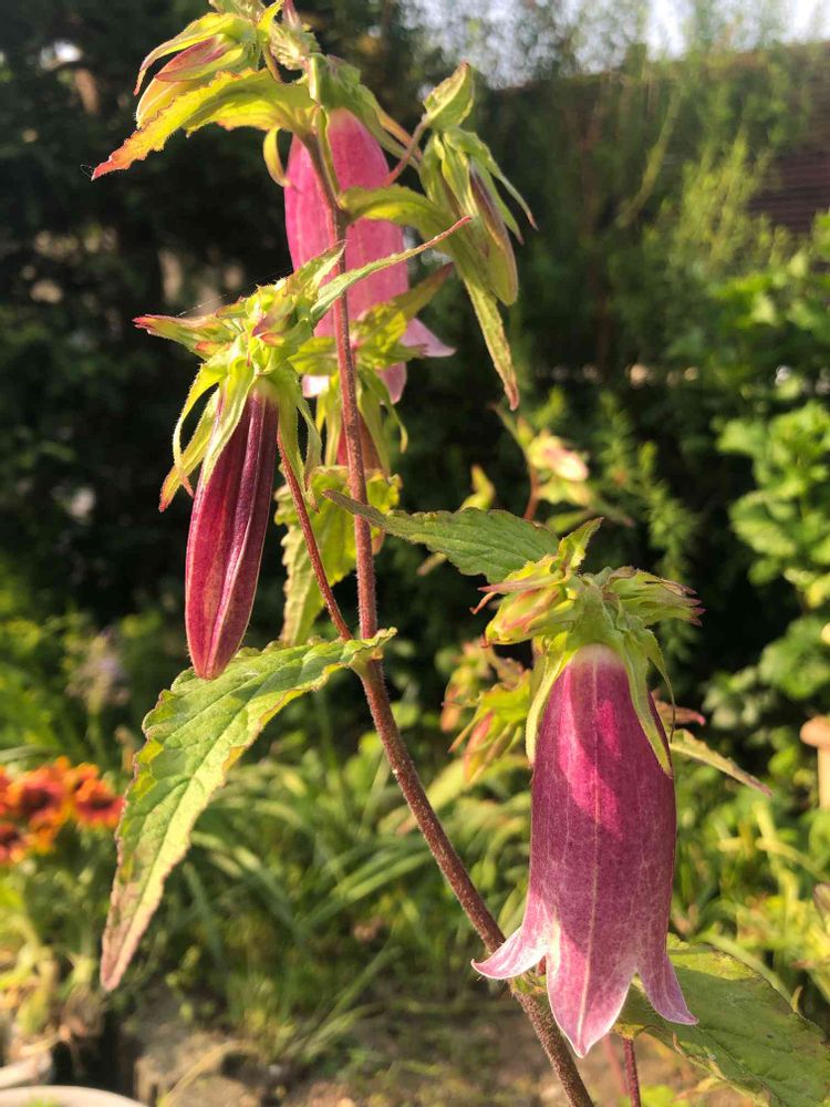 ホタルブクロ いつの間にか白ばなはなくなり、赤のみ咲いています 朝日がさしてなおあかい