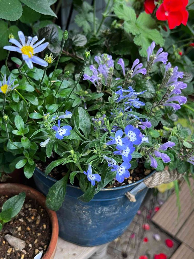 ロベリアが青い鉢の中で冬越しできたので、アジュガとブルーデイジーとタツナミソウを追加してみました😊
