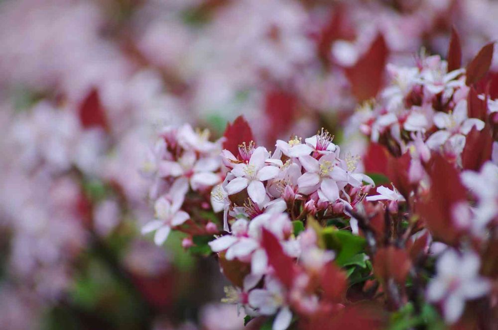 春の新芽が赤味を帯び、1,5cmくらいの小さなお花は 白〜淡いピンク。一見シャリンバイとは違う印象です。