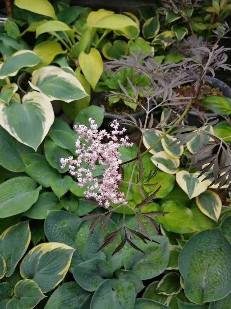 ホスタの海に浮かぶ西洋ニワトコ (エルダーフラワー)ブラックレースのお花。