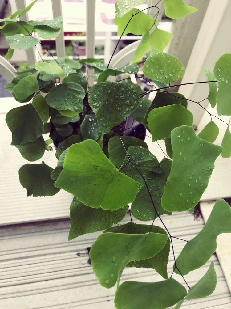 ホームセンターの花屋さんをぶらぶらしてたら 見たことない植物発見。即購入 アジアンタム・ペルビアナムと書いてありました。アジアンタム前購入しましたが失敗し一度葉っぱ切り様子見てます。今回はうまくいくかな?頑張ります。