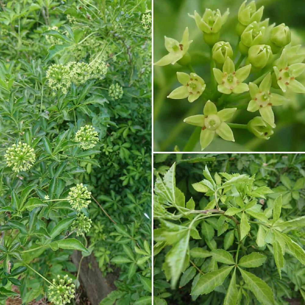 実家の 生け垣の ウコギが 花を咲かせていました🎇🌿🎇💚