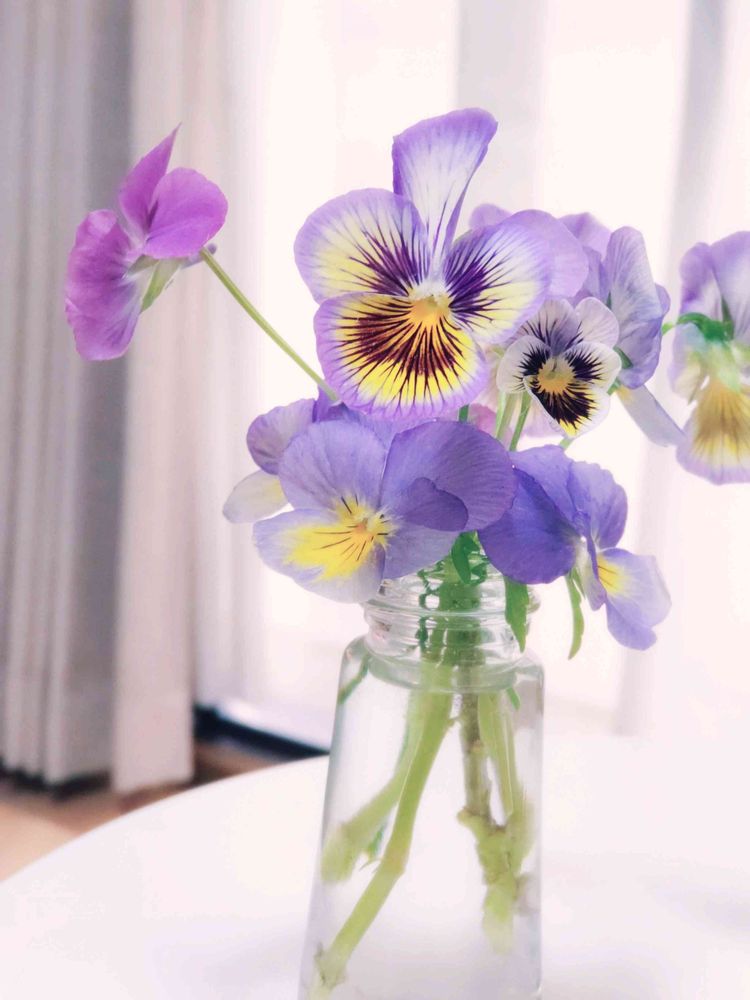 以前は、パンジー・ビオラは「花壇の花」というイメージでしたが、雑誌で切り花として飾っていたのを見て、「切って飾るのも可愛い!」と目からウロコでした^^