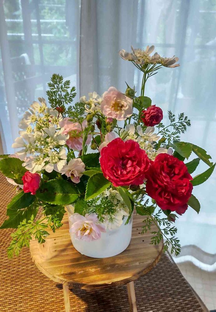 アーチに咲いている赤とピンクのつるミニ薔薇にホワイトレースフラワー・オルレアを合わせてアレンジしてみました💐