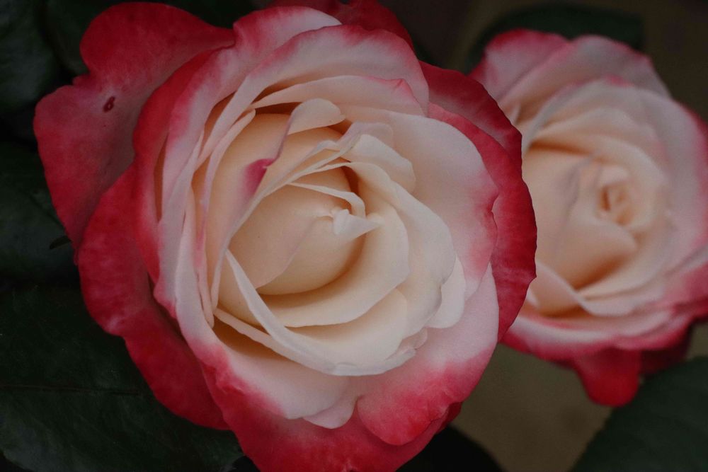 鉢植えのバラ ノスタルジーが咲いています。赤と白のコントラストの色合いが美しいバラでダブルデライト(22/5/23投稿)とよく似たバラです。ダブルデライトのほうが大きな花で赤の発色も見事です。