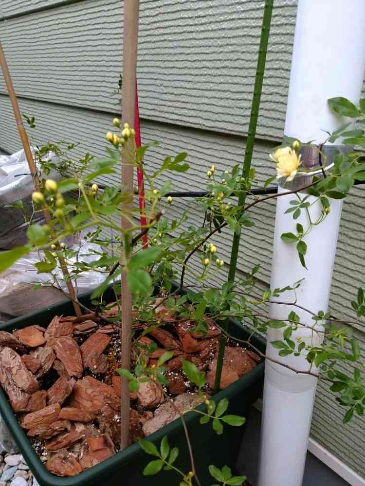 正方形の内径35cm、高さ42cmのコンテナに、モッコウバラを植え込みました。