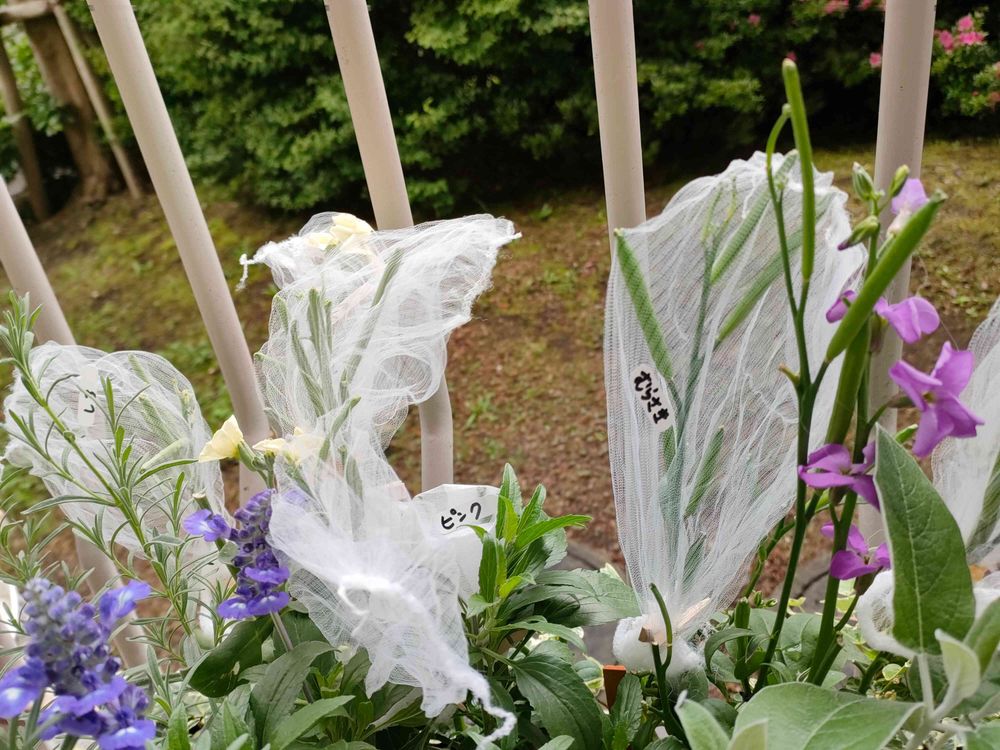 ストックの種を取るため、ストッキングネットをかぶせました。