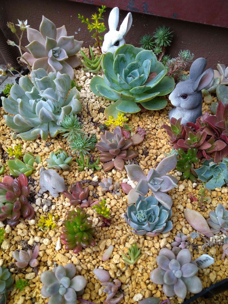 和室外のちいさなスペース、昨年から無遮光、雨ざらしチャレンジから冬越しさせた子たちに、丈夫そうな子たちや増やした子たち、それとDAISOさんからお迎えした🐇さんたち💓