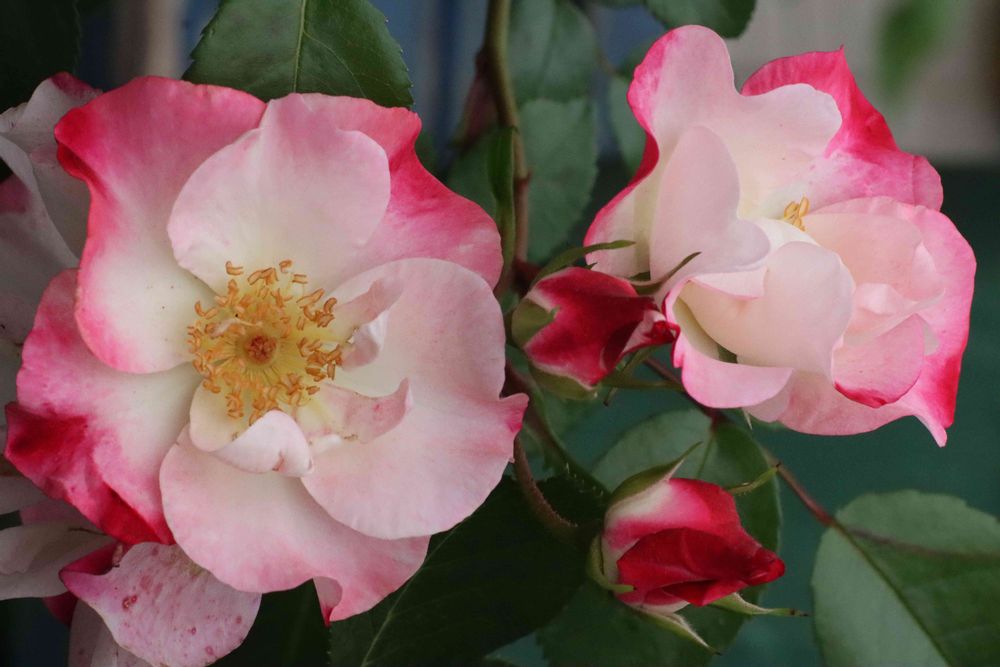 鉢植えのバラ 花霞が咲いています。8㎝ほどの大きさの半八重咲きのバラです。咲き始めは淡いピンク色ですが、咲き進むにつれ、花びらの先から濃いピンク色に色づきます。