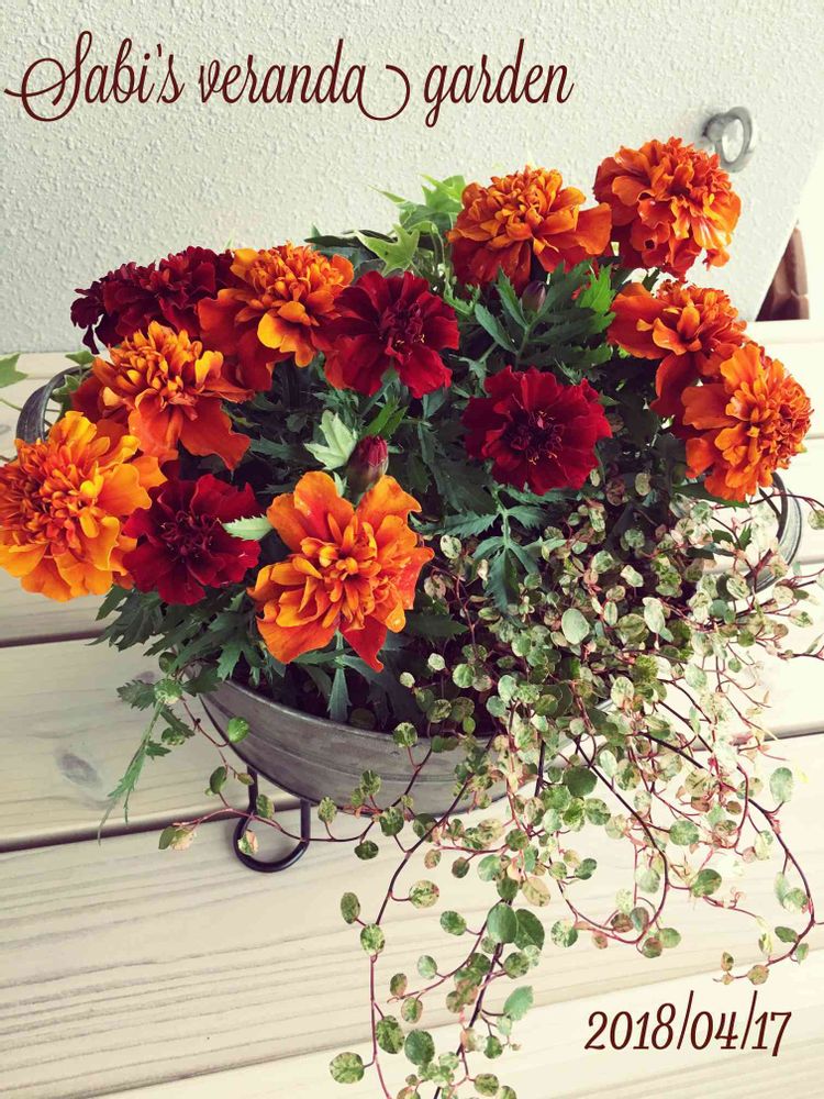 バルコニー/ベランダ,ワイヤープランツスポットライト,フレンチマリーゴールド ファイヤーボールの投稿画像