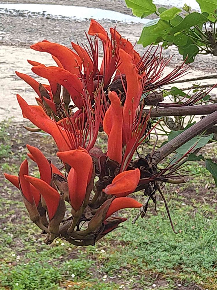 憧れの花!小笠原海域海底火山の噴火による軽石が今も残る海岸。フーテンの寅さん映画、最終作「○○○紅の花」の撮影地に小舟(渡船)に乗ってやって来ました!奄美、加計呂麻島諸鈍の大木並木にて