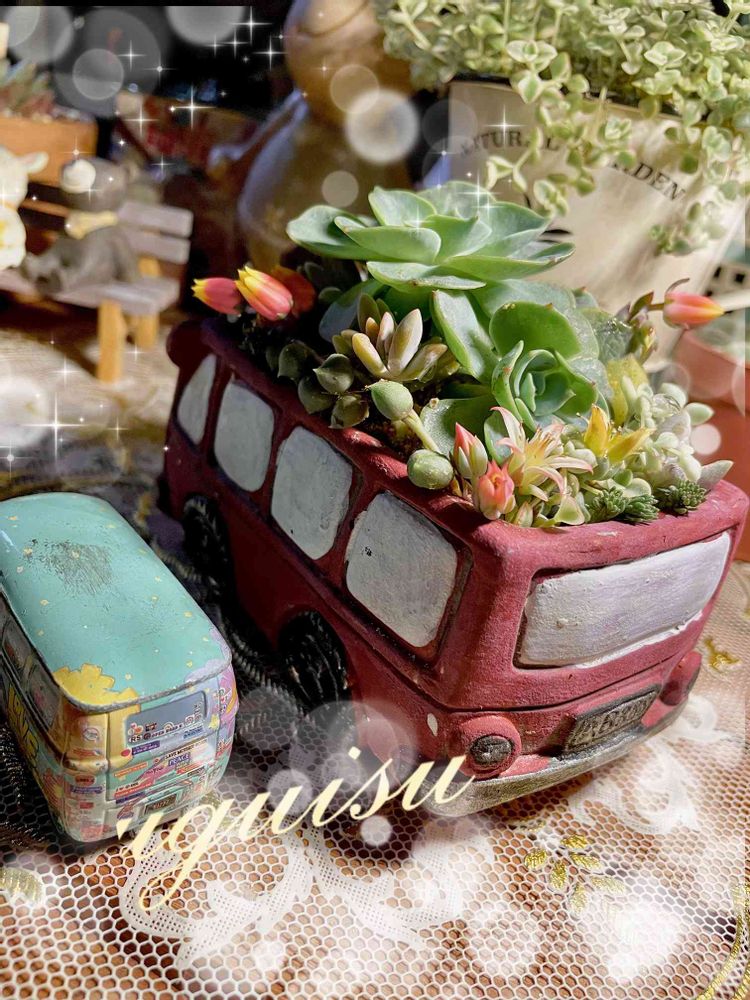本日の寄せ植えは、ワーゲンバス🚌に多肉のお花畑💐をイメージして寄せ植えしました💕