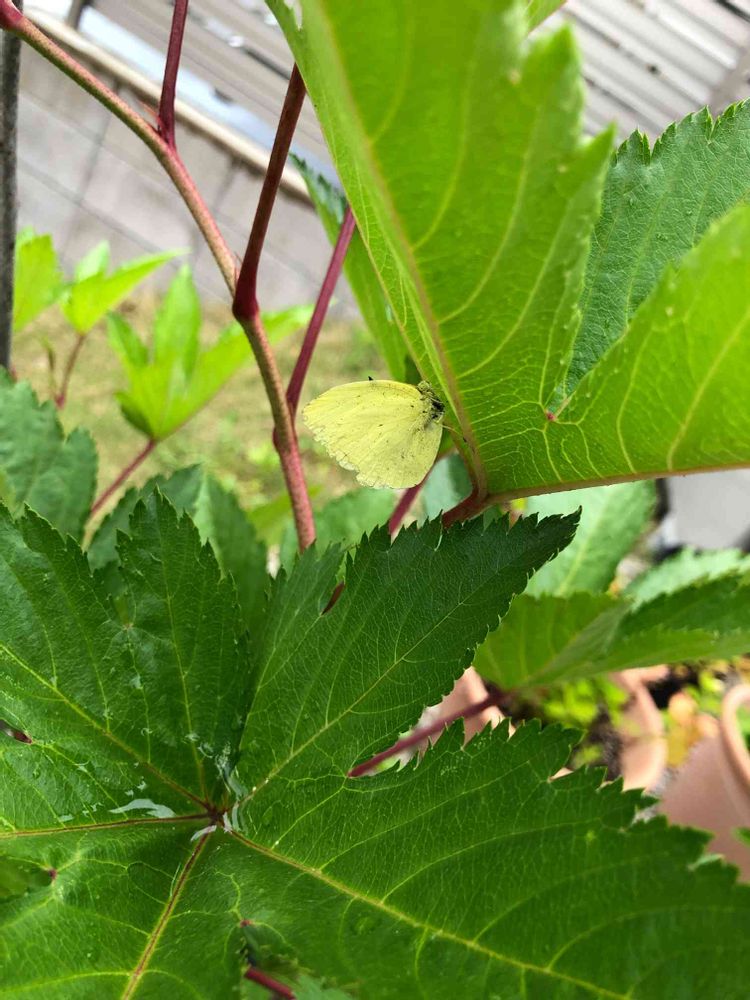 カジイチゴの葉の裏で蝶が休んでいました😌
