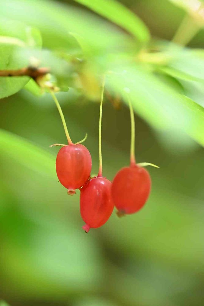 春先の花もかわいい花でしたが、今ごろは透き通る赤い実を可愛らしく吊り下げている姿を見かけます。🍒😊
