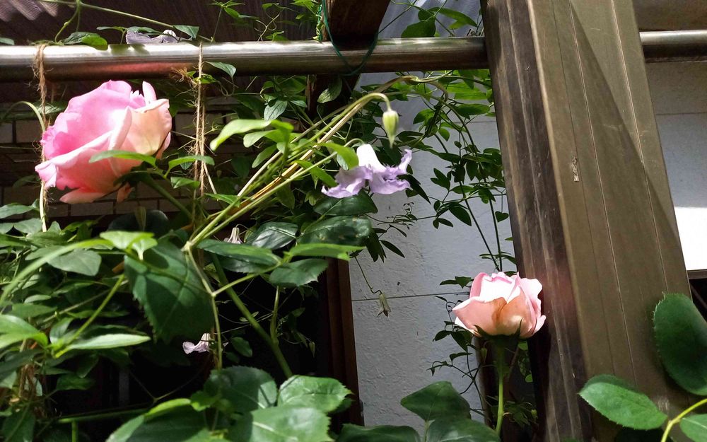 アングル良くないけど、クレマチスとつるばらが仲良く咲いています。