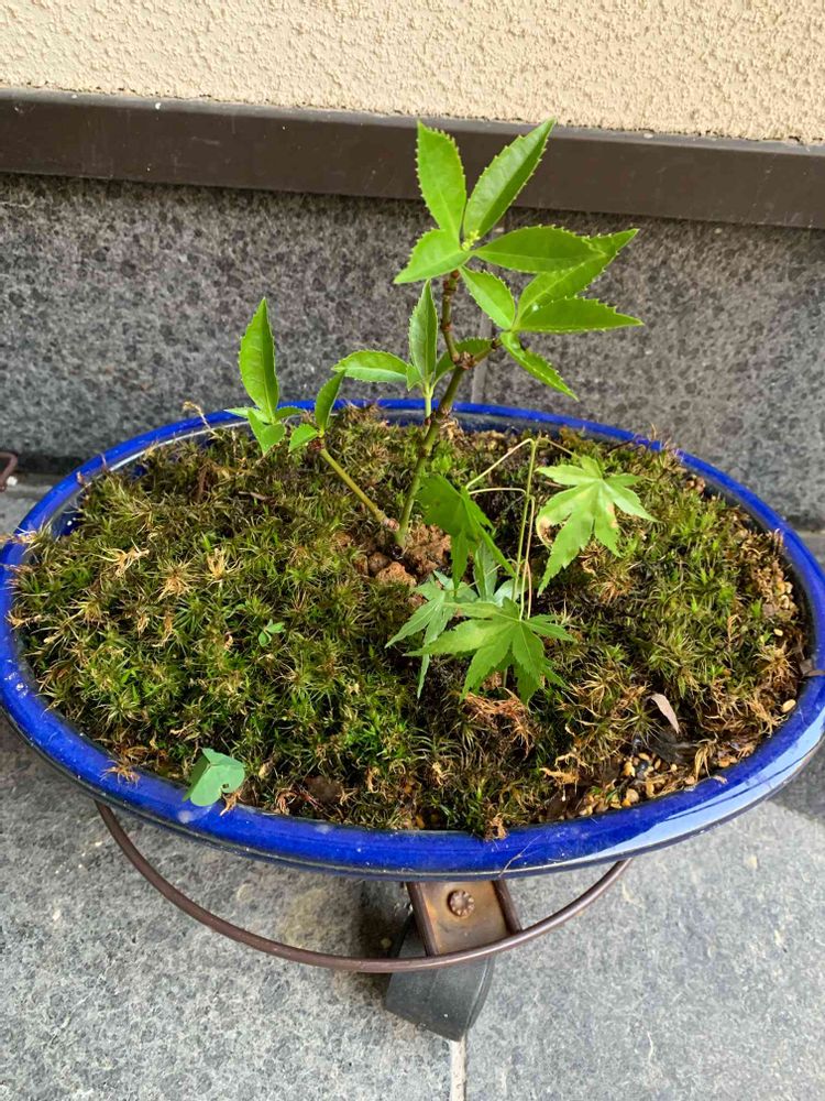 こぼれ種からの紅葉を、シッポ苔の鉢に植え込みました。