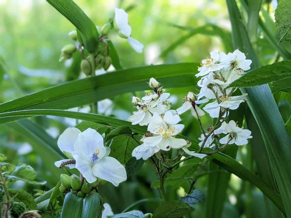 昨日朝の斜面で 野茨の白花と紫露草の白花が仲良く とても素敵でした