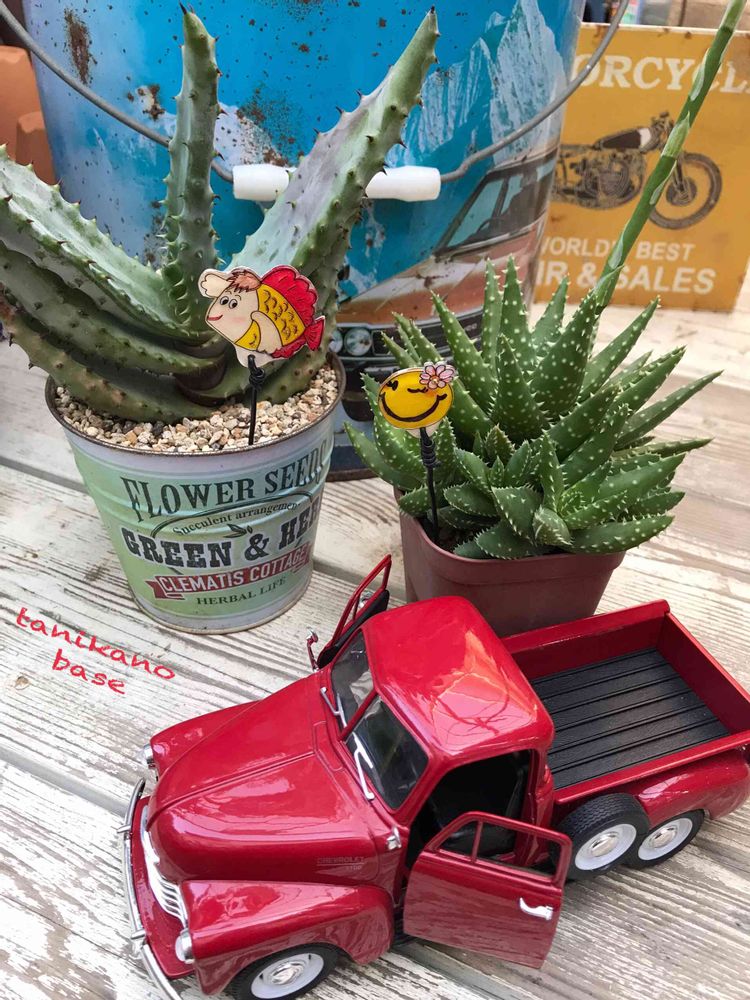 たい焼きくんのピックのアロエ。似た子がうちにも同じ子かなぁ。赤トラは大切なおもいでですね。