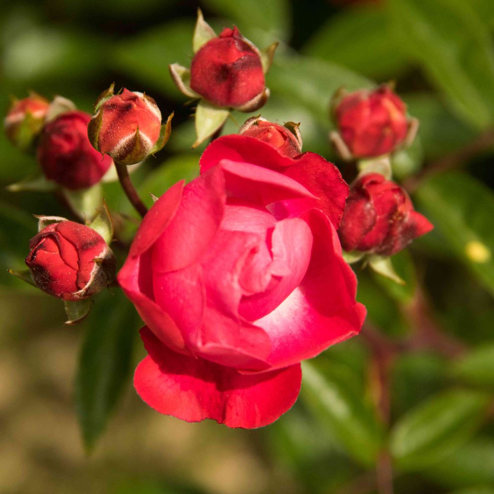 「濃い赤のカップ咲きです。ポリアンタの系統は枝変わりが多く、オレンジ色のファザーズ・デイもあります。四季咲き。」